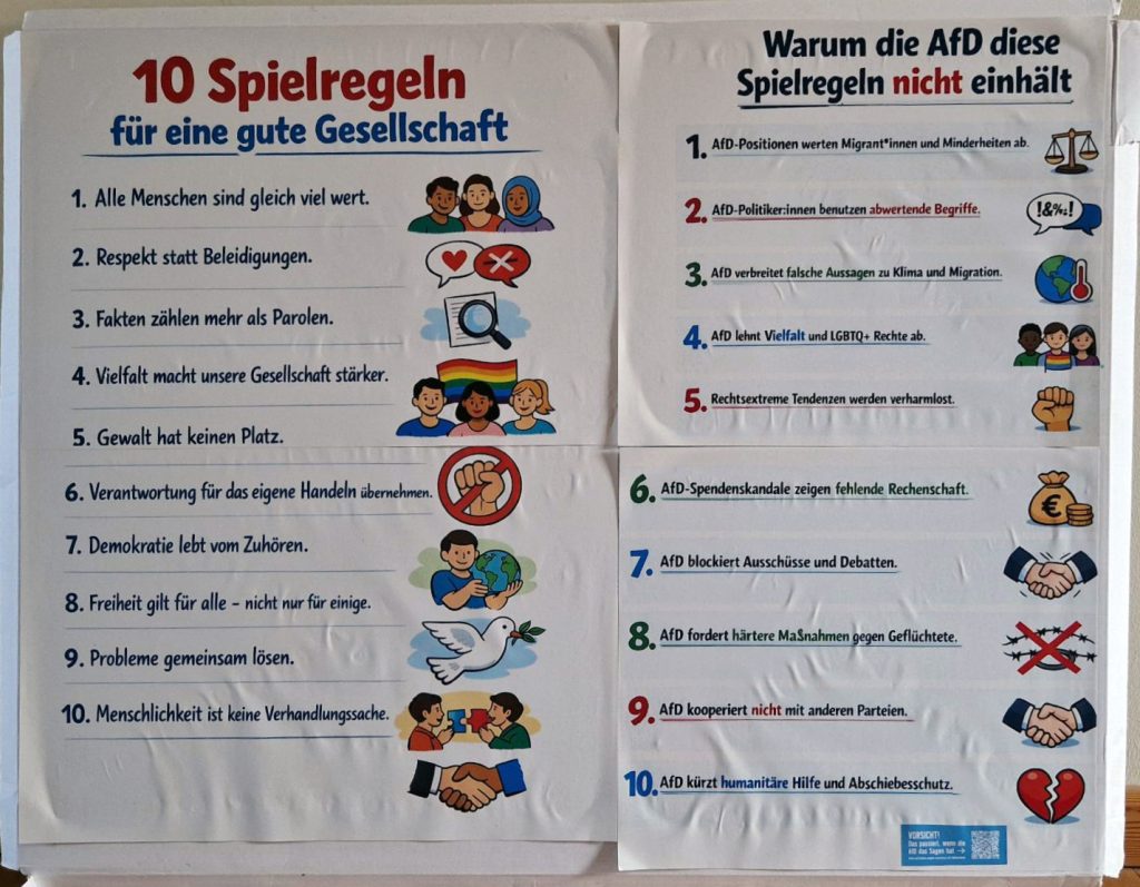 In einer Ansprache stellte eine Teilnehmerin die „10 Spielregeln für eine gute Gesellschaft“ vor und hat aufgezeigt, wie die AfD diese Prinzipien missachtet. Demokratie lebt vom Miteinander, von Respekt und der Bereitschaft, sich für eine offene Gesellschaft einzusetzen.