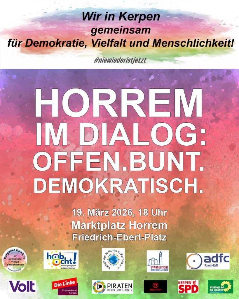 Am 19.3.2026 sind über 60 Menschen unserer Einladung gefolgt und haben auf dem Friedrich-Ebert-Platz in Horrem gezeigt: Kerpen steht für Zusammenhalt, Vielfalt und eine wehrhafte Demokratie!